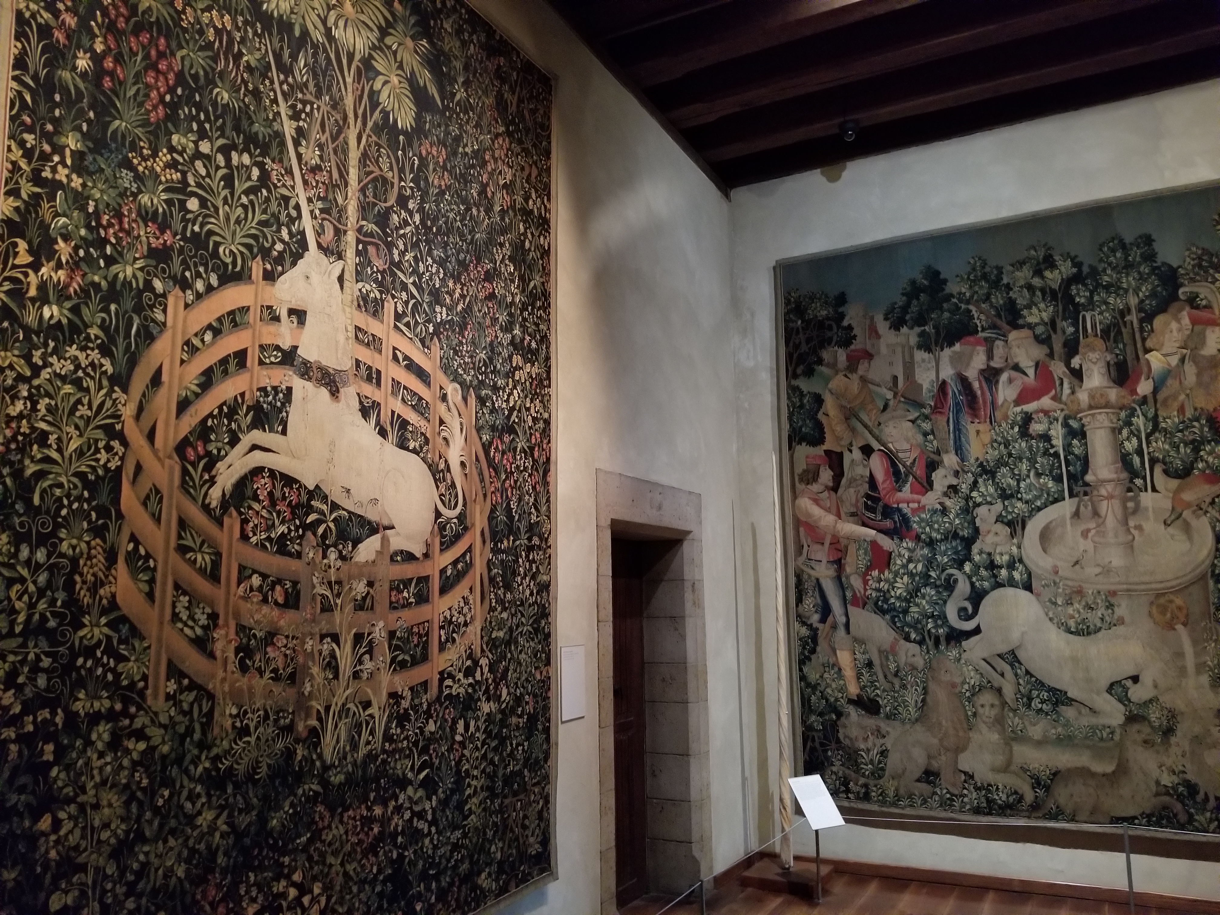이 박물관 전시품들은 주로 르네상스 이전 중세 시대 종교적인 작품들이고 유명한 작품은 많지 않다. 가장 인기있는 작품들은 종교와 별 관련이 없어 보이는 유니콘을 사냥하는 모습을 묘사한 Tapestry 들이다. 중세 시대 상상 속의 동물인 유니콘은 그 뿔이 해독제 또는 만병통치약 같은 효과가 있다고 믿어졌다고 한다. 유니콘은 아주 힘이 세고 사나워서 포획하기가 어려운데 처녀 앞에선 유순해져서 처녀를 앞세워 사냥했다는 이야기도 있다. 이런 이야기가 처녀 (동정녀) 와 핍박받는 예수의 이미지와 연결되어 유니콘이 예수님의 상징이 되기도 했다고 한다. 유니콘은 고대의 인도, 중국, 그리스 문헌에도 기록이 나온다고 한다. 아마도 코뿔소에 대한 목격담이 전달되는 과정에서 탄생된 상상 속의 동물이었을 것인데 2008 년에 ‘진짜 유니콘’ (돌연변이 외뿔 사슴) 이 발견되었다는 기사가 타임지에 실리기도 했다. http://content.time.com/time/health/article/0,8599,1814227,00.html