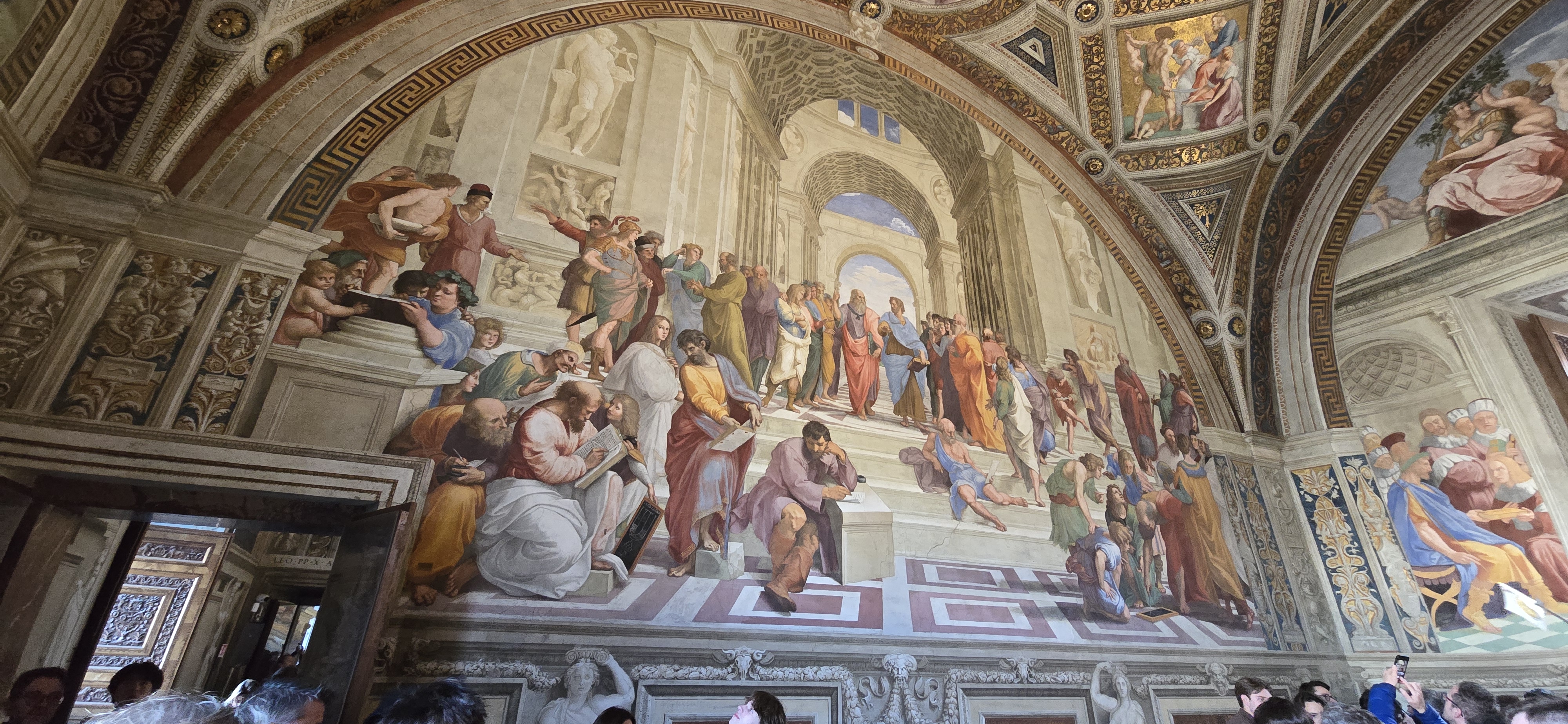 시스티나 성당 전에 위치한 라파엘로의 방 (Stanze di Raffaello) 에는 낯익지만 교황청에 어울리지 않을 것 같은 벽화 (아테네 학당) 가 있다. 벽화 중앙에 긴 수염을 하고 있는 인물이 플라톤 (외모는 레오나르도 다 빈치를 모델로 했다고 한다) 이고 그 오른쪽 파란 옷이 아리스토텔레스이다. 플라톤의 손가락은 하늘을 향하고 있고 아리스토텔레스의 손가락은 앞을 가리키는 것은 두 사람의 철학적 차이를 나타낸 것이라 한다. 이 벽화는 당시 교황의 주문에 의해 라파엘로가 그린 것인데 신앙과 이성의 조화를 추구한 르네상스 시대의 가톨릭 교회의 의도를 나타낸다.