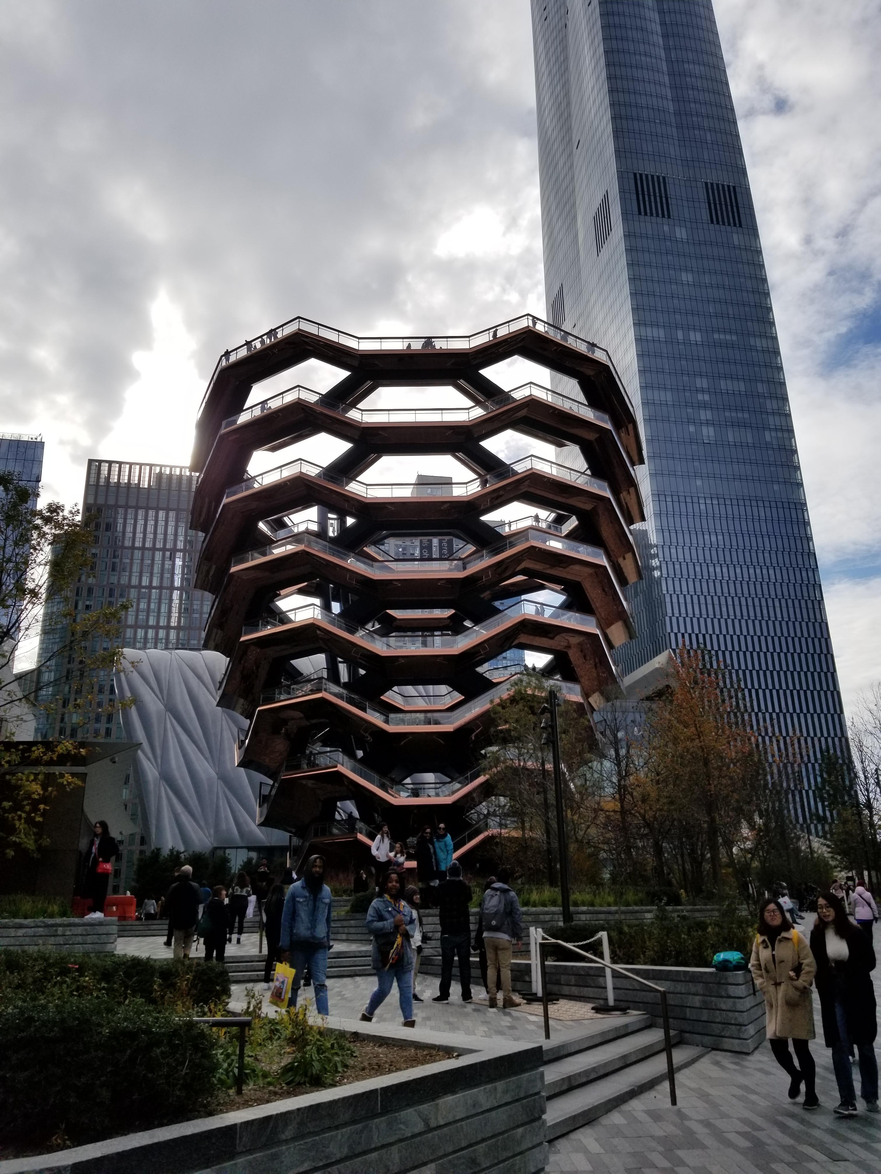 하이라인의 북쪽 끝이 Hudson Yards 이다. 허드슨 야드는 기차들을 세워 놓는 거대한 주차장이었는데 최근에 주상 복합 단지로 개발된 지역이다. 이곳에서 가장 눈길을 끄는 건축물은 뒤집어진 원뿔모양의 Vessel 이다. 16층에 2500 계단으로 구성되어 있는데 모든 계단을 걸으면 1 mile (1.6km) 라고 한다. 걸어 올라가 보면 경치도 좋고 옆 아파트 사는 사람들 산책/운동 코스로 좋겠다 싶었는데 젊은 친구들이 연달아 뛰어내려 자살하는 바람에 (이제까지 세명) 요샌 올라가지 못하게 막아 놓았다. 지난번에 가 보았을 때 아래층은 다시 개방한 듯 보였다. 배 (선박) 라는 뜻으로 Vessel 이라는 이름을 쓴 모양인데 임시로 쓴 이름이고 정식 이름을 공모 중이라고 한다.