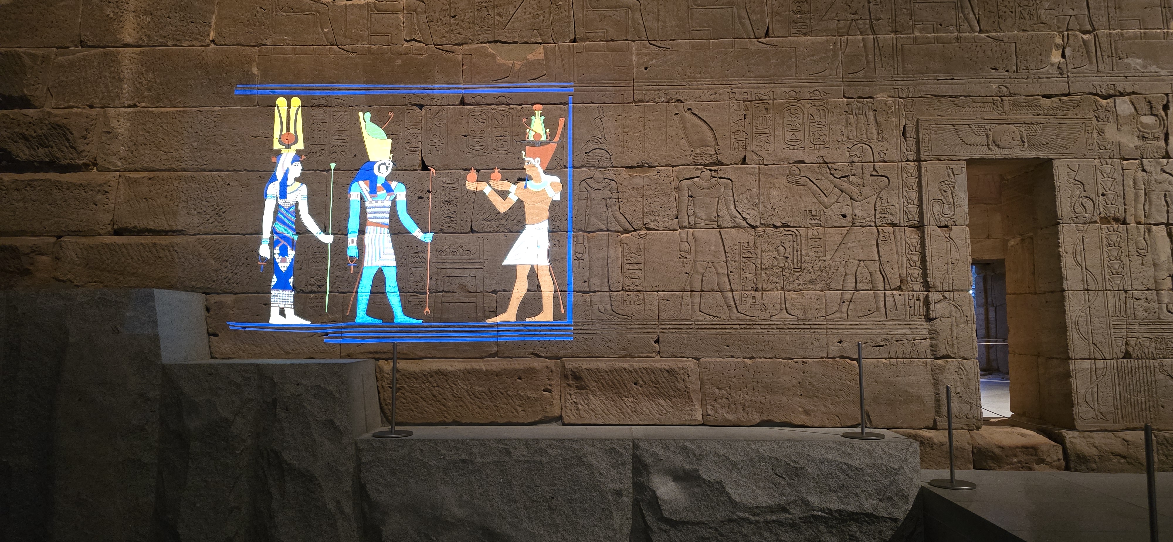 가까이 보면 사원의 벽면에 여러 암각화가 보인다. 원래는 채색이 되어있었는데 수몰 등의 이유로 탈색되었다. 사원 왼쪽 벽면에 프로젝터를 이용해 암각화가 채색되어 있었을 때 어떤 모습이었을지를 보여준다. 채색된 암각화에서 오른쪽에서 제물을 바치는 사람이 아우구스투스이고 왼쪽 둘은 이집트 신이다. 사원의 건축 목적이 로마의 이집트 통치를 알리고 받아들이게 하려는 정치적인 의도가 있었기 때문에 로마 황제 겸 이집트의 파라오로서 신에게 제물 바치는 아우구스투스의 모습을 그린 것이다. 채색 프로젝터는 늦게까지 문을 여는 주말 저녁 때만 켠다고 한다. 신전 벽에는 19세기에 이집트에 관광 왔던 몰지각한 영국인이 남긴 낙서도 남아 있다.