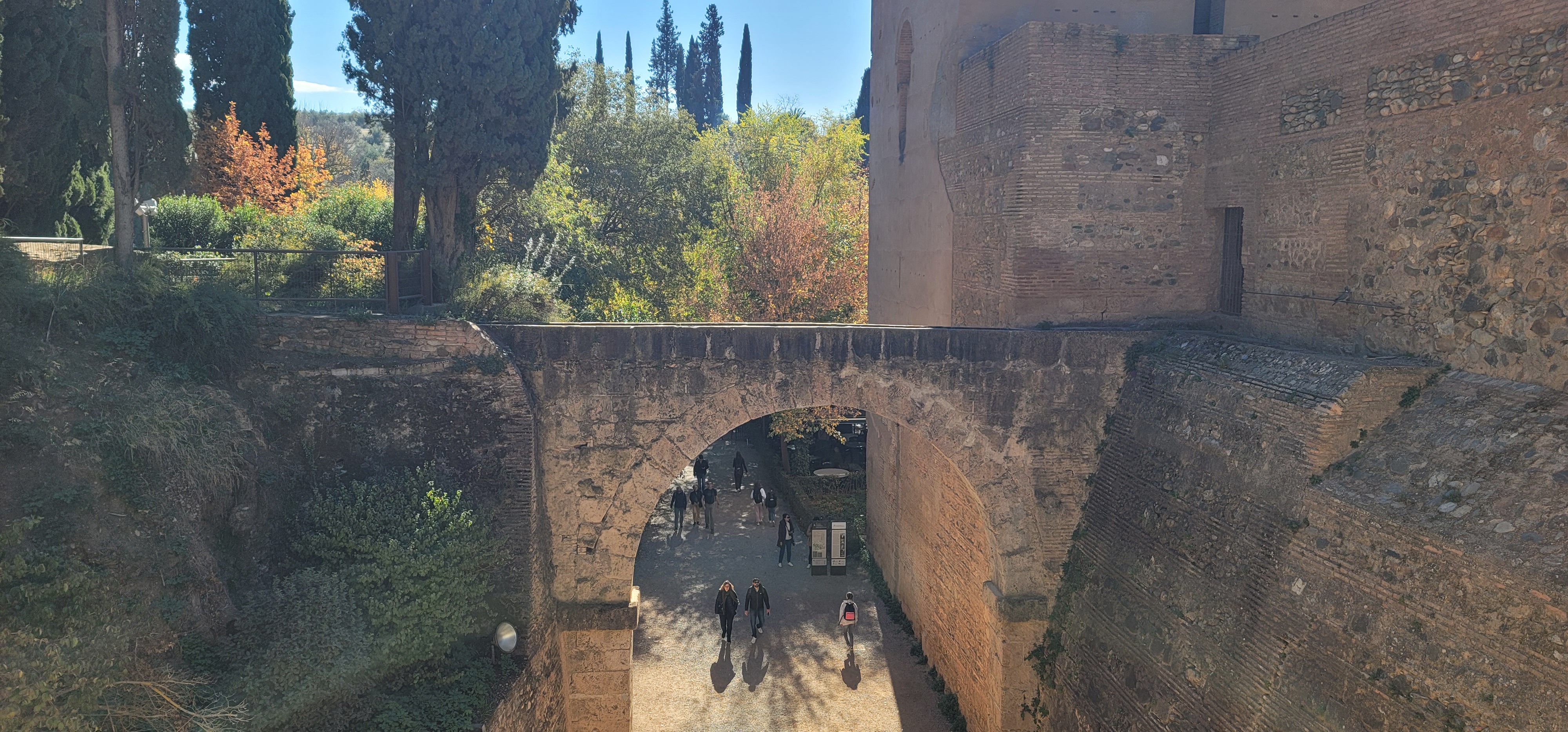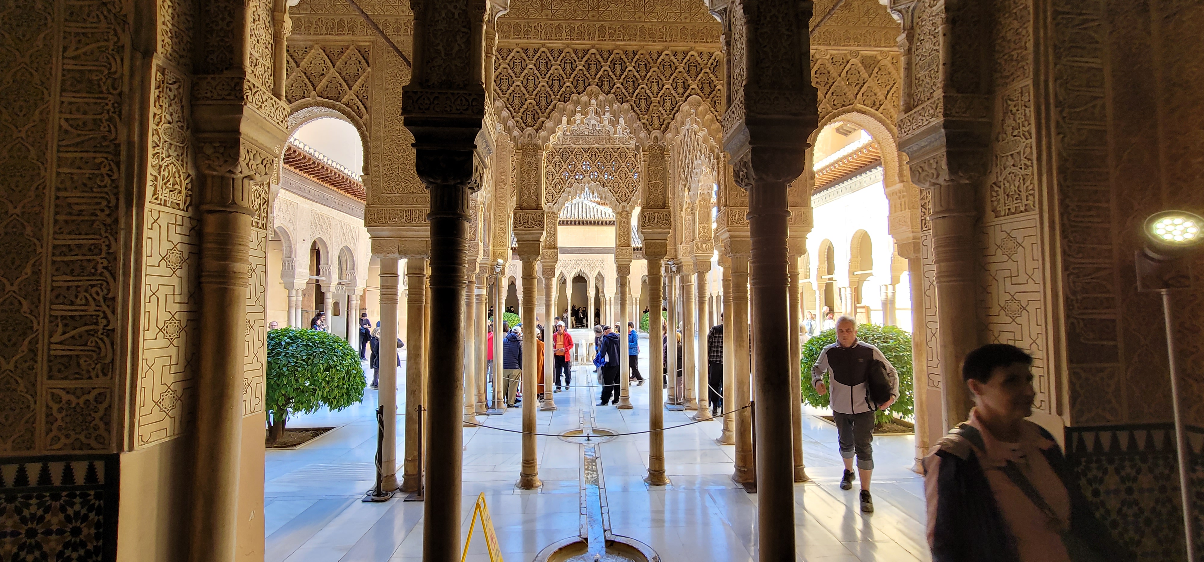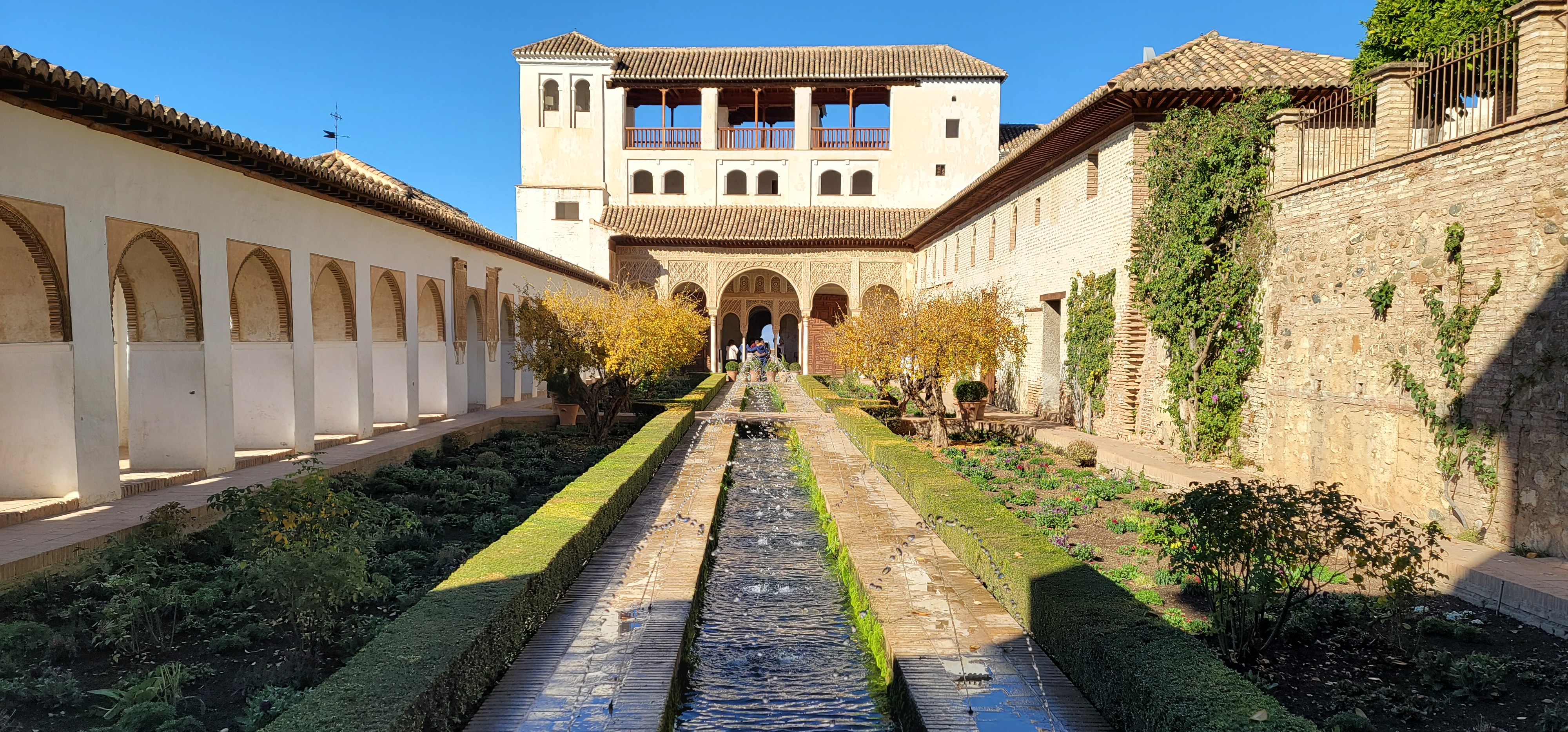 그라나다의 알함브라 궁전은 이슬람 황금기가 끝나가던 시기 (13세기) 에 건설되기 시작했다. 이땐 무어인들이 이베리아 반도 남쪽으로 밀려나 있던 시기였고 알함브라 궁전이 언덕 위의 요새였던 것도 이런 맥락과 관계가 있을 것이다. 알함브라 는 붉은 성이라는 의미인데 성벽이 붉은 빛을 띠어 붙여진 이름이다. 1492년 알함브라는 기독교 세력에 의해 함락되고 이후 스페인 왕들의 거처로 사용되기도 했다.