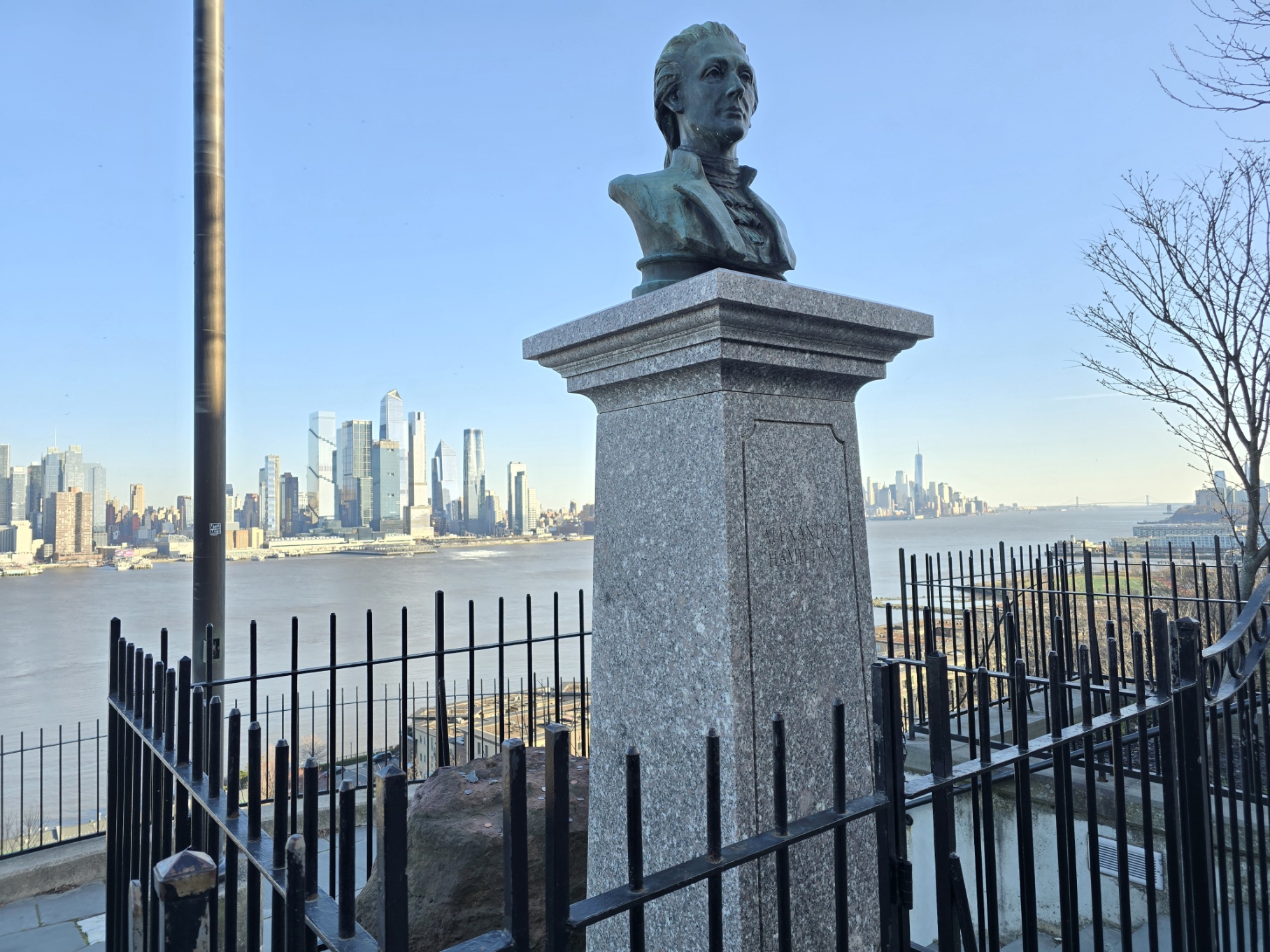 맨해튼 스카이 라인을 가장 잘 볼 수 있는 곳은 동쪽 강(East River) 건너 Brooklyn 과 Long Island City 가 있고 서쪽 강 (Hudson River) 건너 뉴저지가 있다. 뉴저지 쪽에서 맨해튼 경치가 좋기로 유명한 곳 중 하나가 해밀턴 파크 (Weehawken, NJ) 이다. 알렉산더 해밀턴은 미국 초대 재무 장관이고 10달러 지페에 초상화가 그려져 있는 미국 건국의 아버지들 중 네번째로 존경받는 사람이다 (1.워싱턴, 2.프랭클린, 3.제퍼슨. 출처 CBS News Poll 2021). 해밀턴은 이 공원 아래쪽 강가에서 당시 부통령이었던 애론 버와 결투하다가 50세가 채 되기 전에 사망했다.