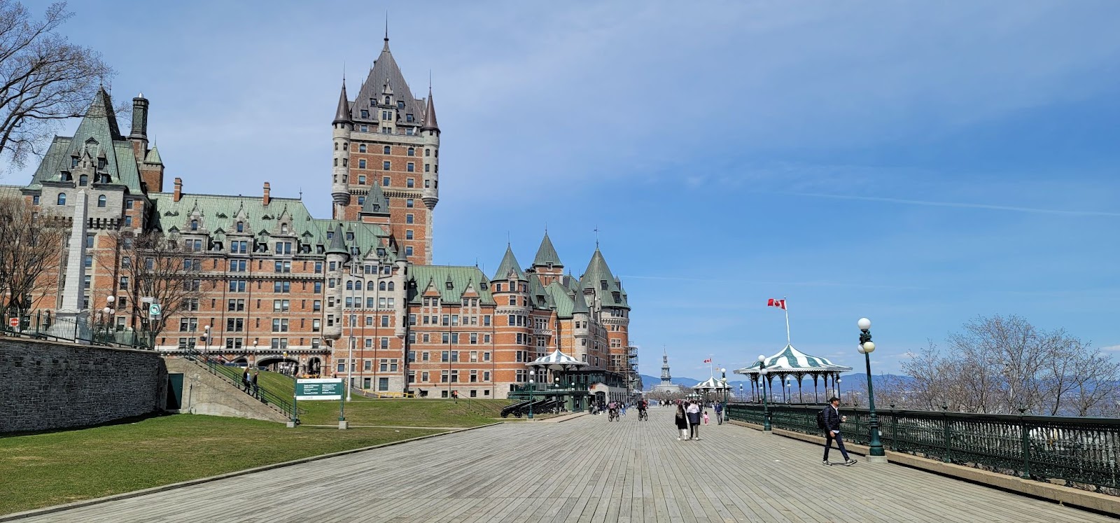 Old Quebec 은 절벽과 성벽으로 방어되었던 윗마을과 서민들이 살던 항구 둘레의 아랫 마을로 나뉘어져 있다. 이 두 마을은 엘리베이터 (funicular) 와 “목 부러질 계단 (Breakneck Stairs)” 으로 연결되어 있다. (좀 가파르긴 해도 목이 부러질 정도는 아닌데 드라마 도깨비 에서 김고은이 공유에게 결혼하자고 하는 장면에 나오는 곳이다.) 앞서 언급한 제일 잘 알려진 건축물 (호텔, Château Frontenac. Fairmont 호텔 체인이 관리해서 그 이름을 앞에 붙여 부른다) 은 윗마을에 있다. 이 호텔은 캐나다 철도 회사가 뉴프랑스 시절 프랑스 총독이 살던 자리에 지은 것이다. 이 호텔 아래 (지하) 엔 그 유적지가 남아있다. Château Frontenac 세상에서 가장 사진이 많이 찍히는 호텔이라고 한다. 누가 세어보았는지 모르겠지만.