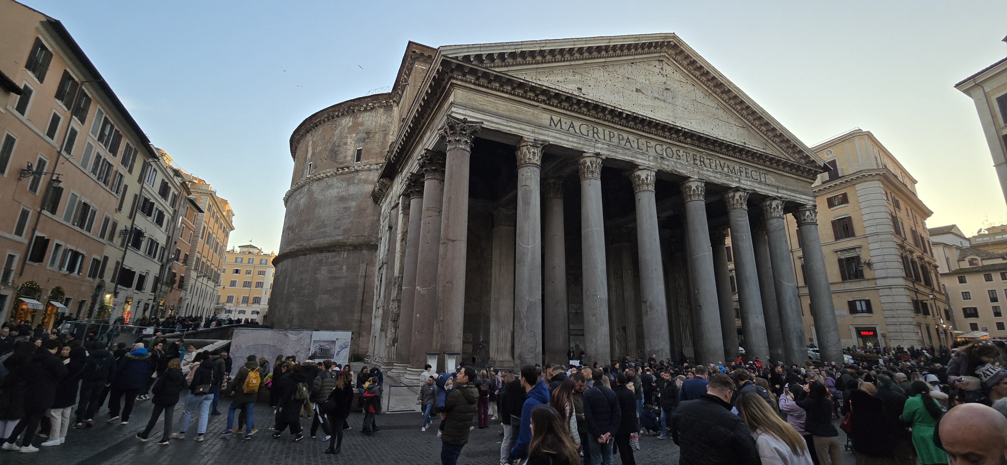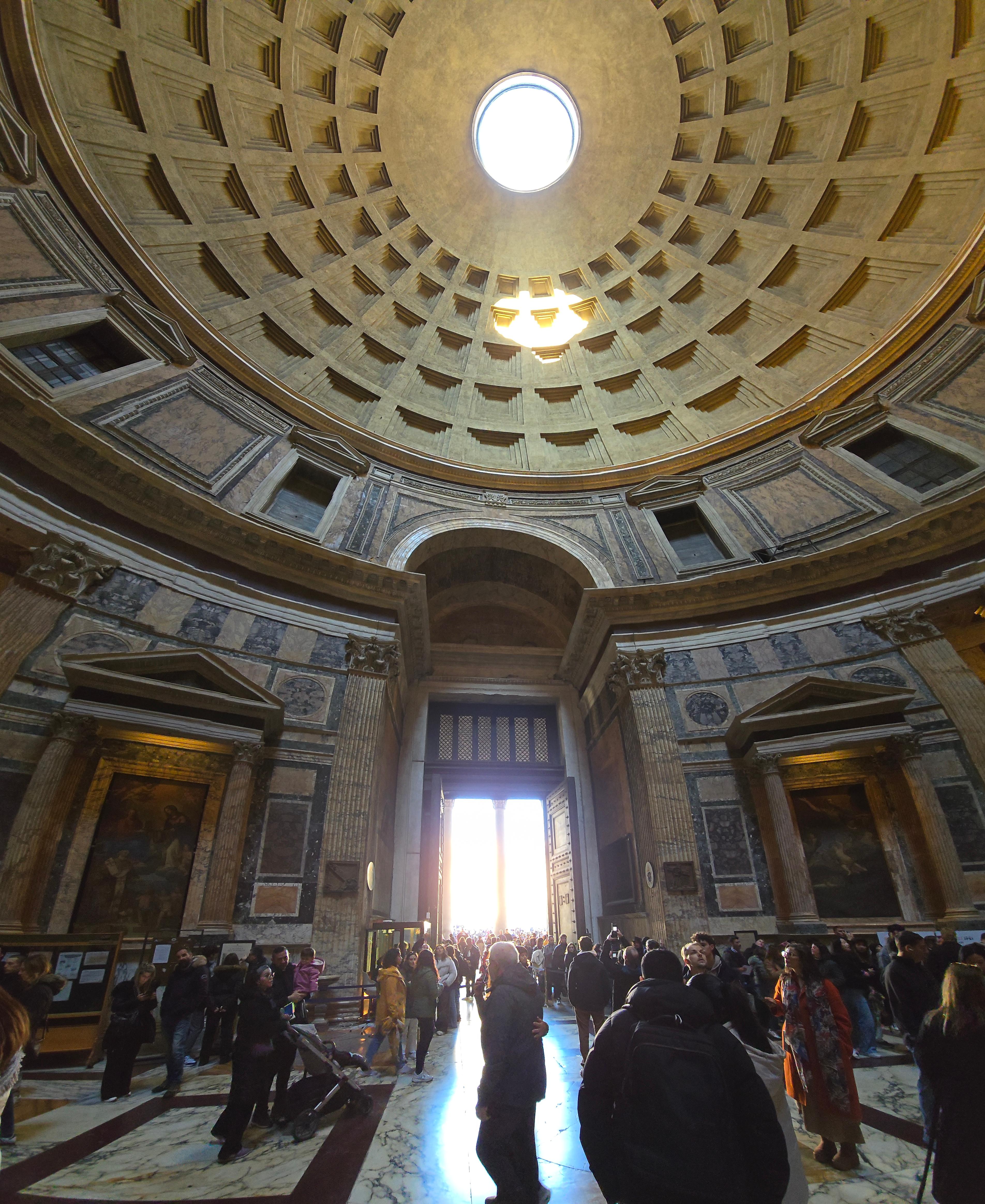 판테온은 고대 로마 시대의 신전으로, 로마의 "모든 신의 신전"이라는 뜻이고, 원래는 기원전 27년에 아그리파 (M. Agrippa)가 지었지만, 지금 남아 있는 건물은 하드리아누스 황제가 기원후 118~128년 사이에 다시 지은 것이라 한다. 아그리파는 고대 로마의 장군이자 건축가인데 그의 흉상이 많이 남아 있어서 19세기에 유럽에서 학생들이 미술시간에 많이 그렸고 그걸 따라 일본에서 그리고 한국에서도 미술시간에 그렸었는데 요즘에도 그러는지는 모르겠다.