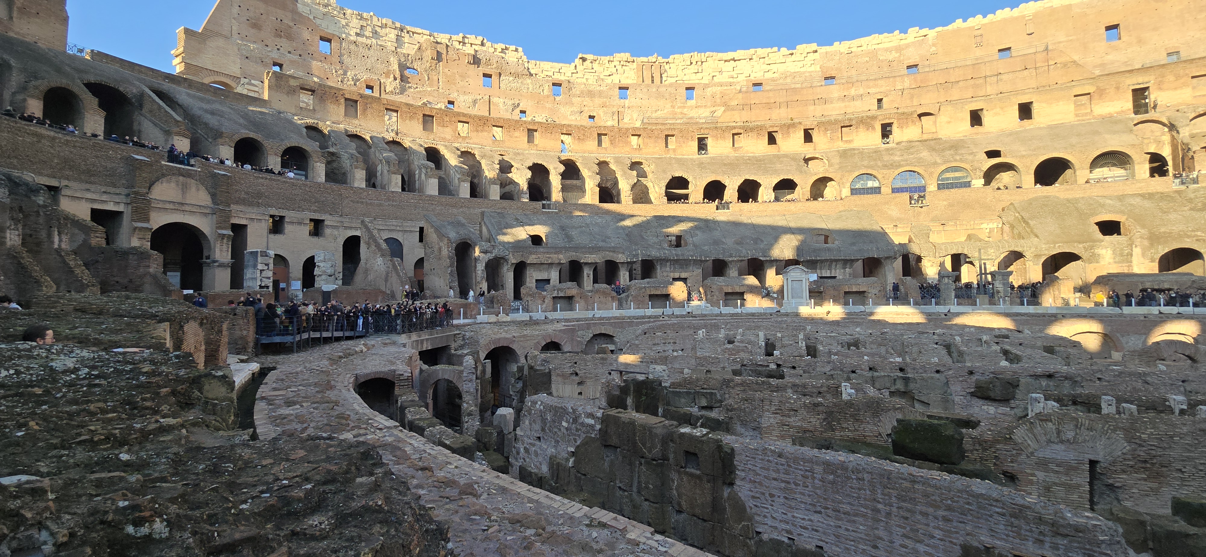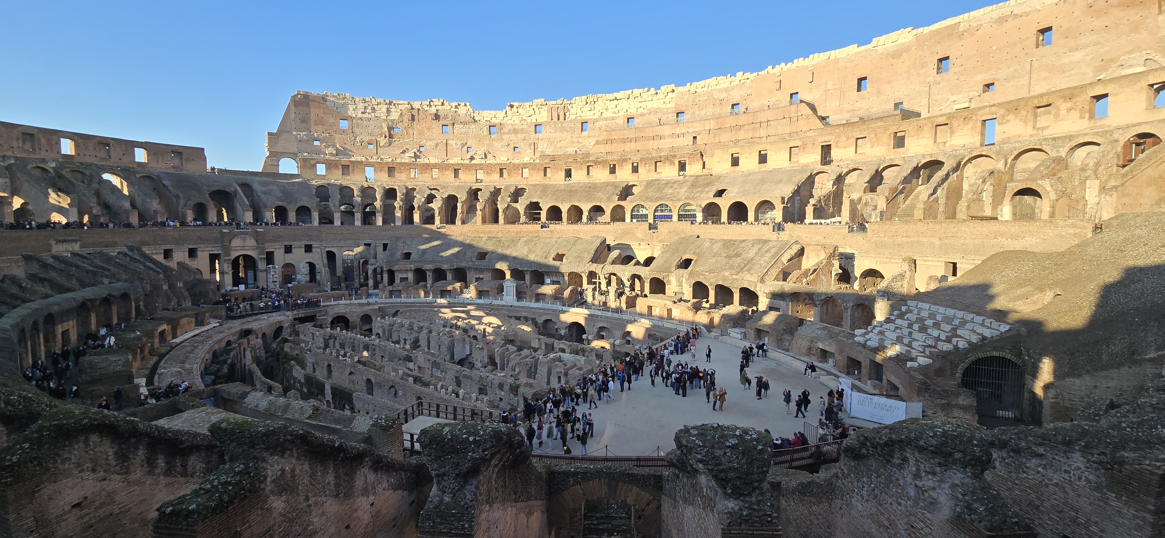 에펠탑이 파리의 상징인 것처럼, 콜로세움은 로마를 대표하는 상징이자 로마에서 가장 인기 있는 관광지이다. 매년 약 7백만명이 방문한다고 한다. Colosseum 은 어원적으로 거대하다는 뜻이다. 건물이 거대해서 붙혀진 이름이 아니고 그 앞에 서있던 네로 황제의 동상이 거대해서 (30 미터 정도) 그리된 것이라 한다. Arena’라는 단어는 원래 ‘모래’를 뜻하는 라틴어에서 유래했으며, 콜로세움의 나무 바닥 위에 모래를 깔았던 구조에서 비롯되어 오늘날 ‘경기장’이나 ‘공연장’을 의미하게 되었다. 지금은 원래 있던 모래와 나무 바닥은 사라지고, 그 아래에 있던 지하 통로와 방들의 벽만이 미로처럼 드러나 있다. 콜로세움이 처음 지어졌을 당시에는 바닥에 물을 채워 배를 띄우고 해전 쇼를 벌이기도 했으며, 그때는 아직 지하 구조물이 존재하지 않았다고 전해진다.
