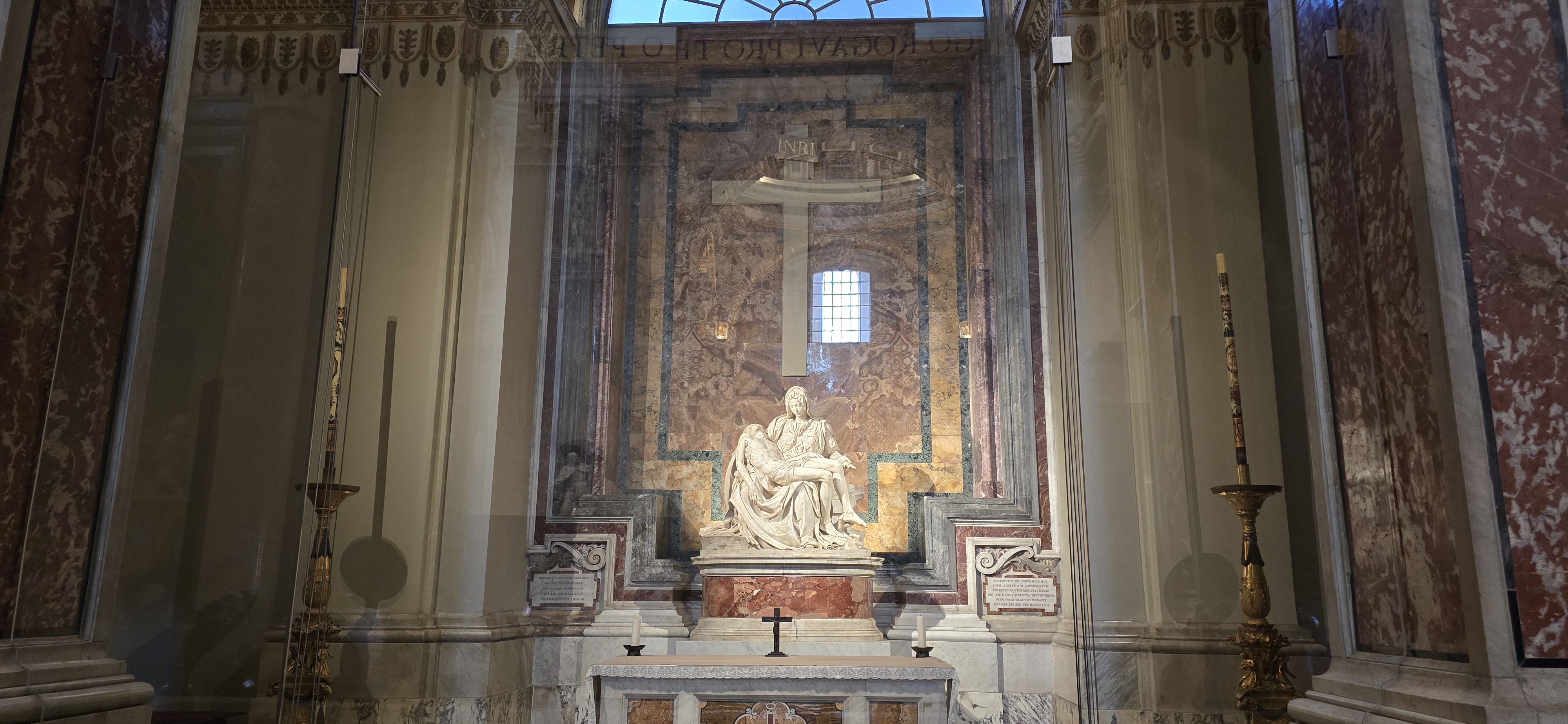 입구로 들어서서 오른쪽에 미켈란젤로의 유명한 피에타 상이 보이고 대제단 앞에는 성 베드로의 무덤 위를 커버하고 있는 청동 발다키노 (덮개, 캐노피) 가 있고 그 위 천장을 올려다 보면 화려하고 아름다운 돔이 보인다. 대제단 뒤에 성령을 상징하는 비둘기 창문과 그 아래 성베드로가 썼다는 의자가 화려한 조각에 파묻혀 있다.