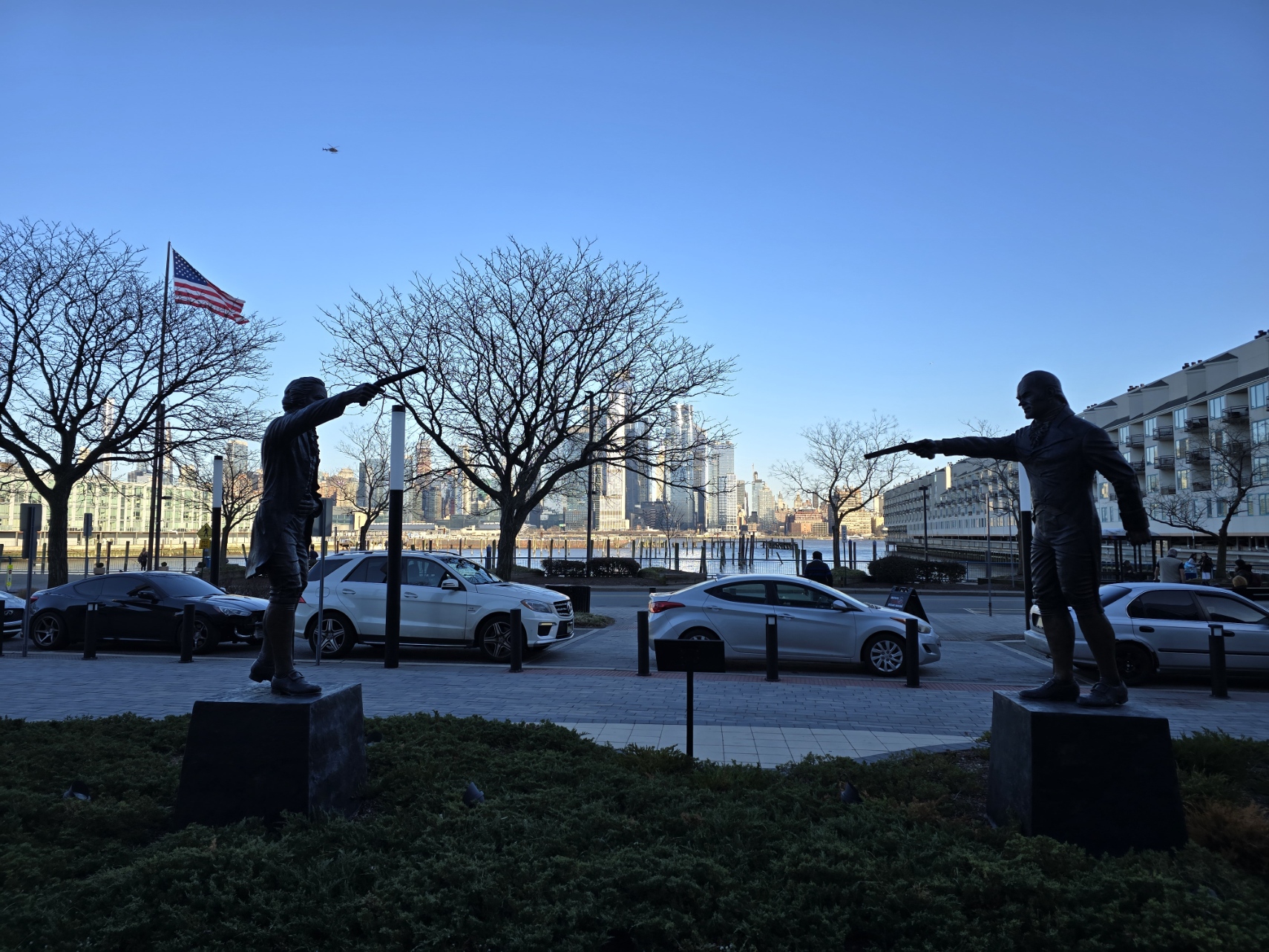 맨해튼 스카이 라인을 가장 잘 볼 수 있는 곳은 동쪽 강(East River) 건너 Brooklyn 과 Long Island City 가 있고 서쪽 강 (Hudson River) 건너 뉴저지가 있다. 뉴저지 쪽에서 맨해튼 경치가 좋기로 유명한 곳 중 하나가 해밀턴 파크 (Weehawken, NJ) 이다. 알렉산더 해밀턴은 미국 초대 재무 장관이고 10달러 지페에 초상화가 그려져 있는 미국 건국의 아버지들 중 네번째로 존경받는 사람이다 (1.워싱턴, 2.프랭클린, 3.제퍼슨. 출처 CBS News Poll 2021). 해밀턴은 이 공원 아래쪽 강가에서 당시 부통령이었던 애론 버와 결투하다가 50세가 채 되기 전에 사망했다.
